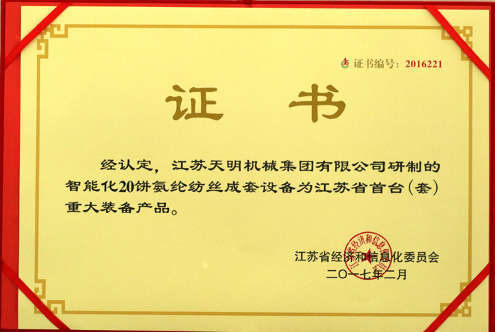 ● 2017年智能化20饼氨纶纺丝成套设备荣获江苏省重点推广应用的新技术新产品